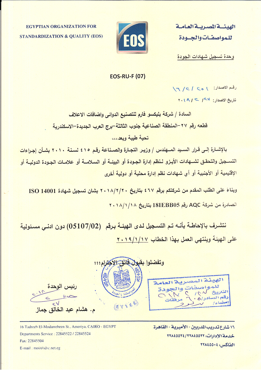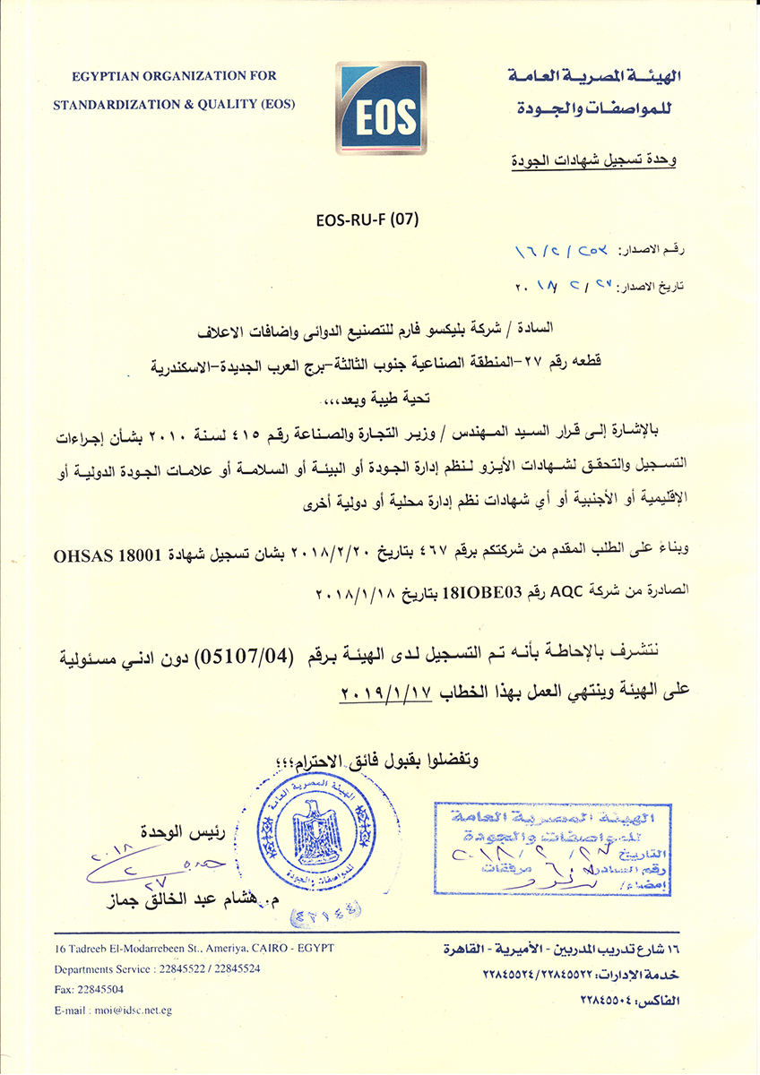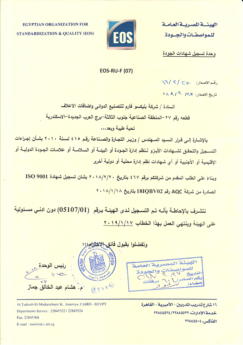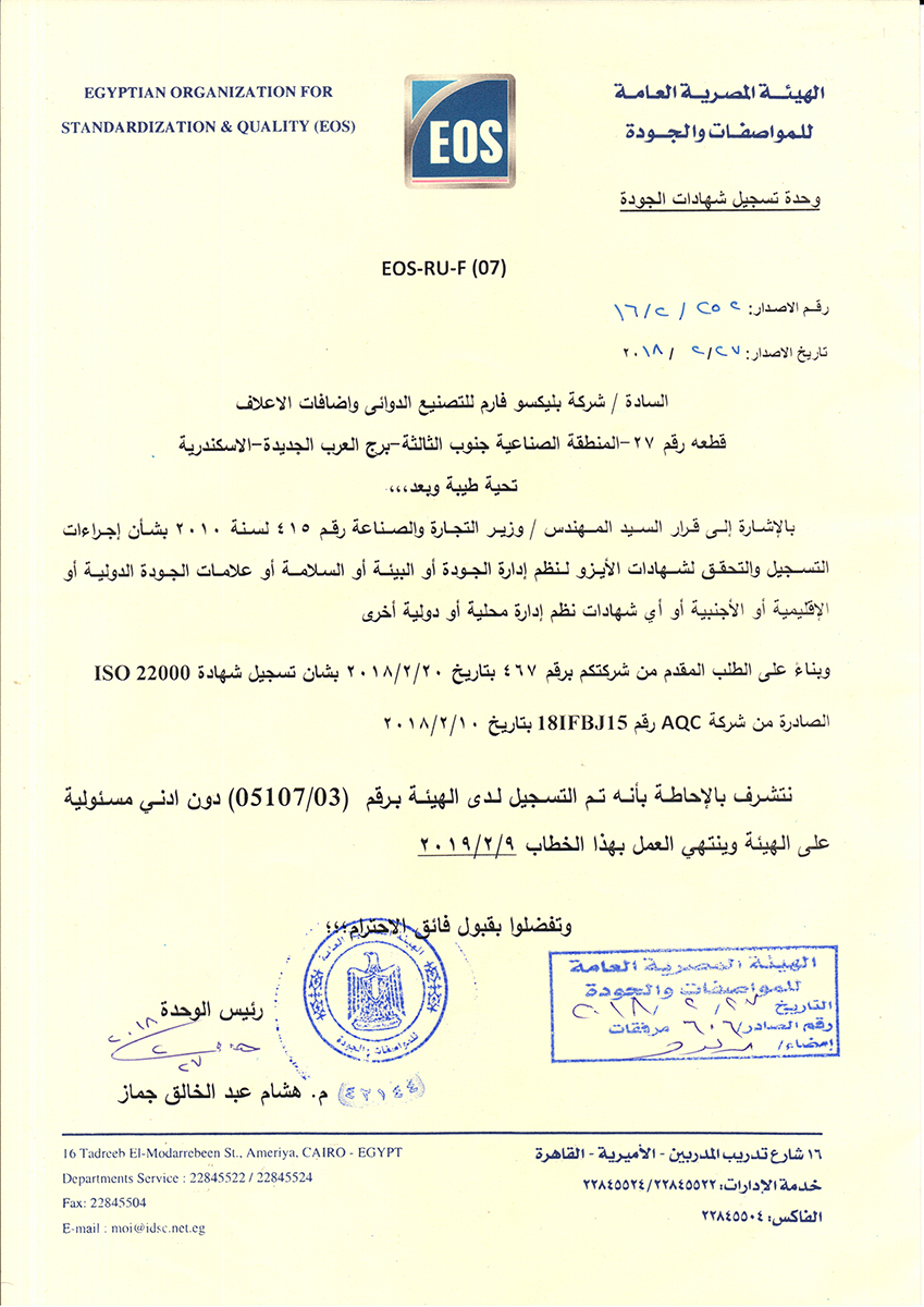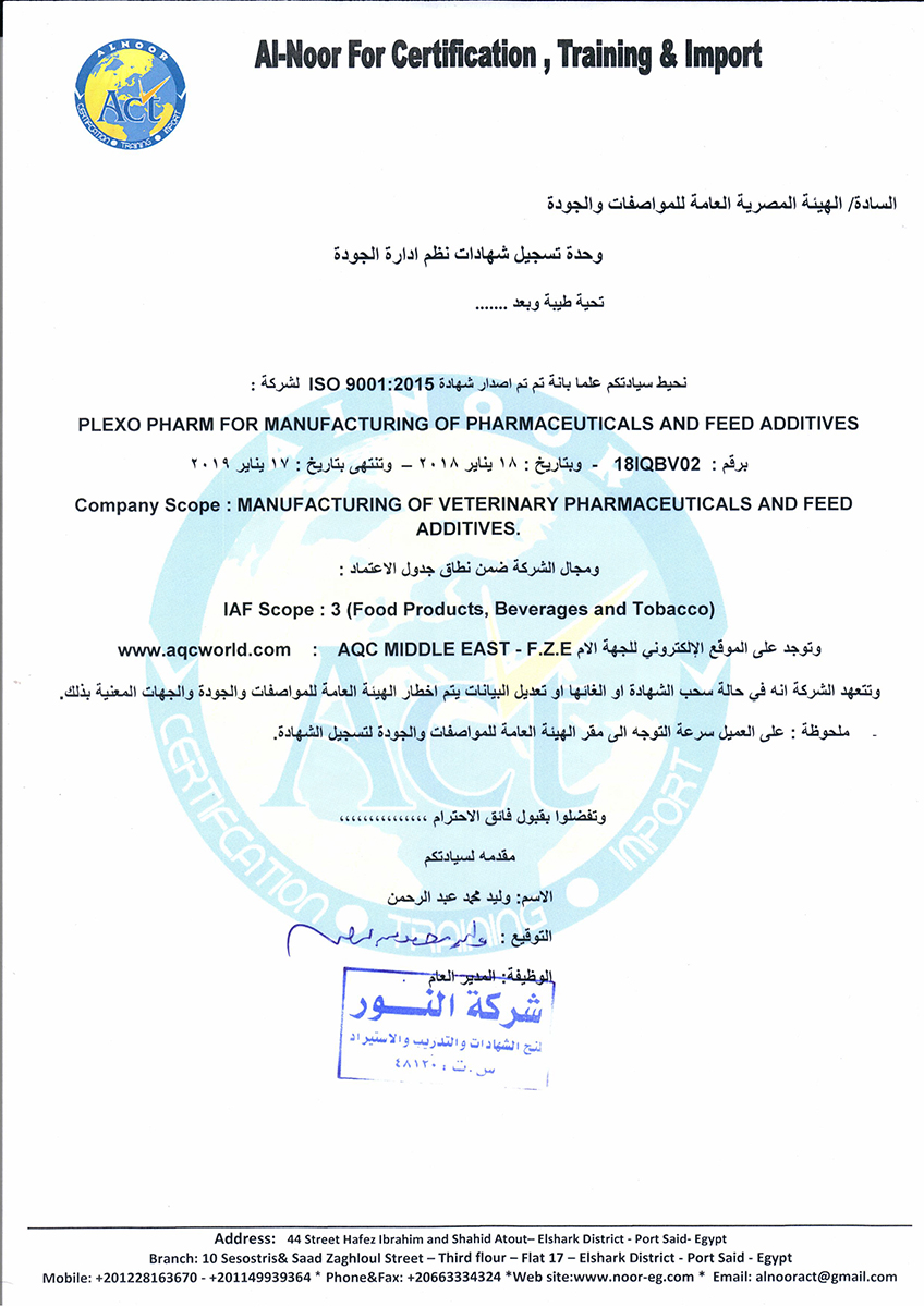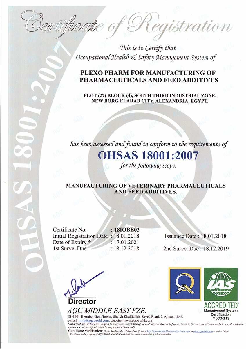 In 2018 PLEXO PHARM CO. Succeeded to pass the standards of Egyptian GMP, as well ISO certificates no.9001/2008, 14001/2004, 22000/2005, 18001/2007.